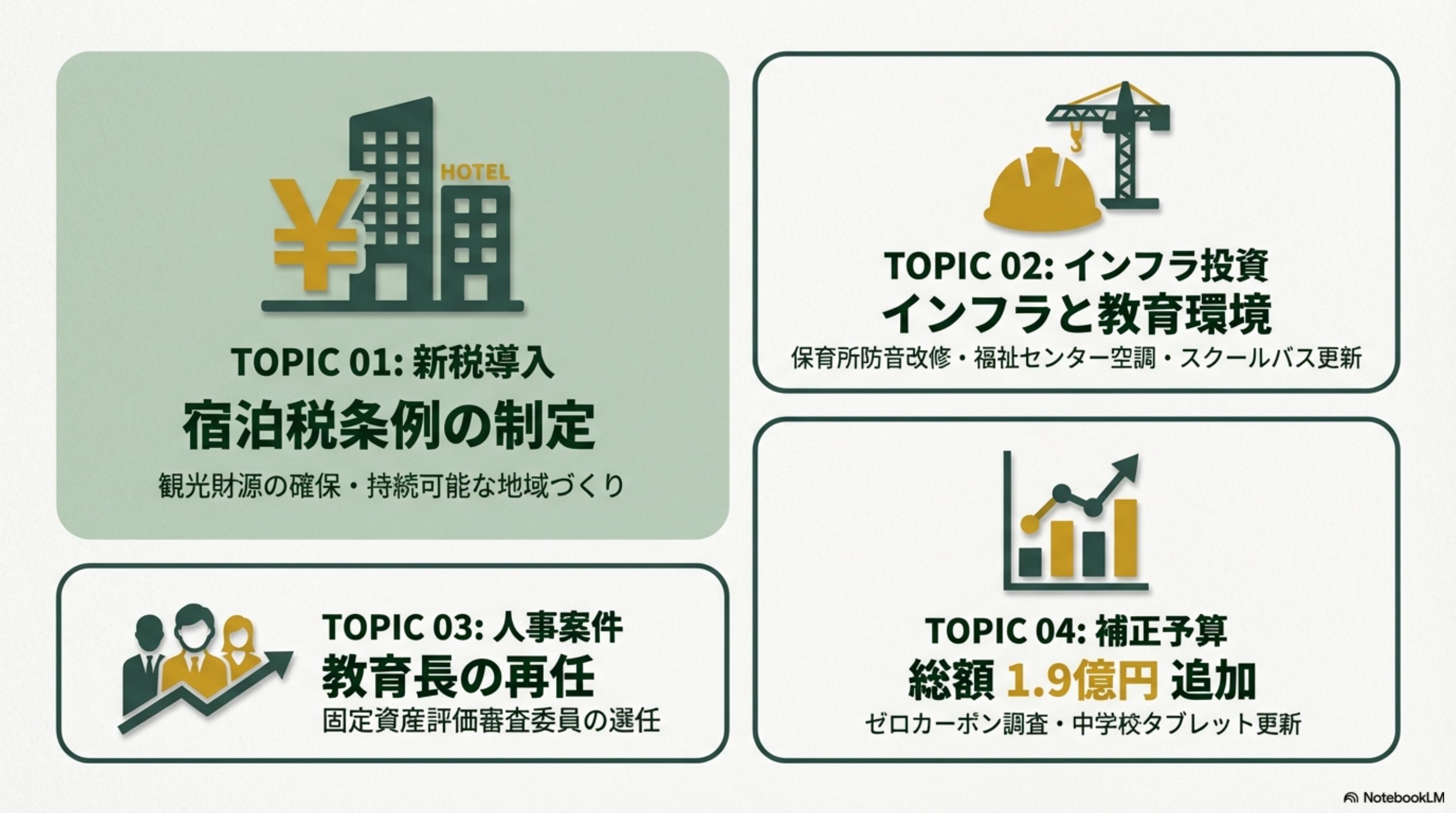 - 宿泊税条例制定(地方税法に基づく法定外目的税、年間税収見込み1,100万円)。保育所防音改修・福祉センター空調・スクールバス更新のインフラ整備。教育長の再任。補正予算1.9億円(ゼロカーボン調査・中学校タブレット更新)