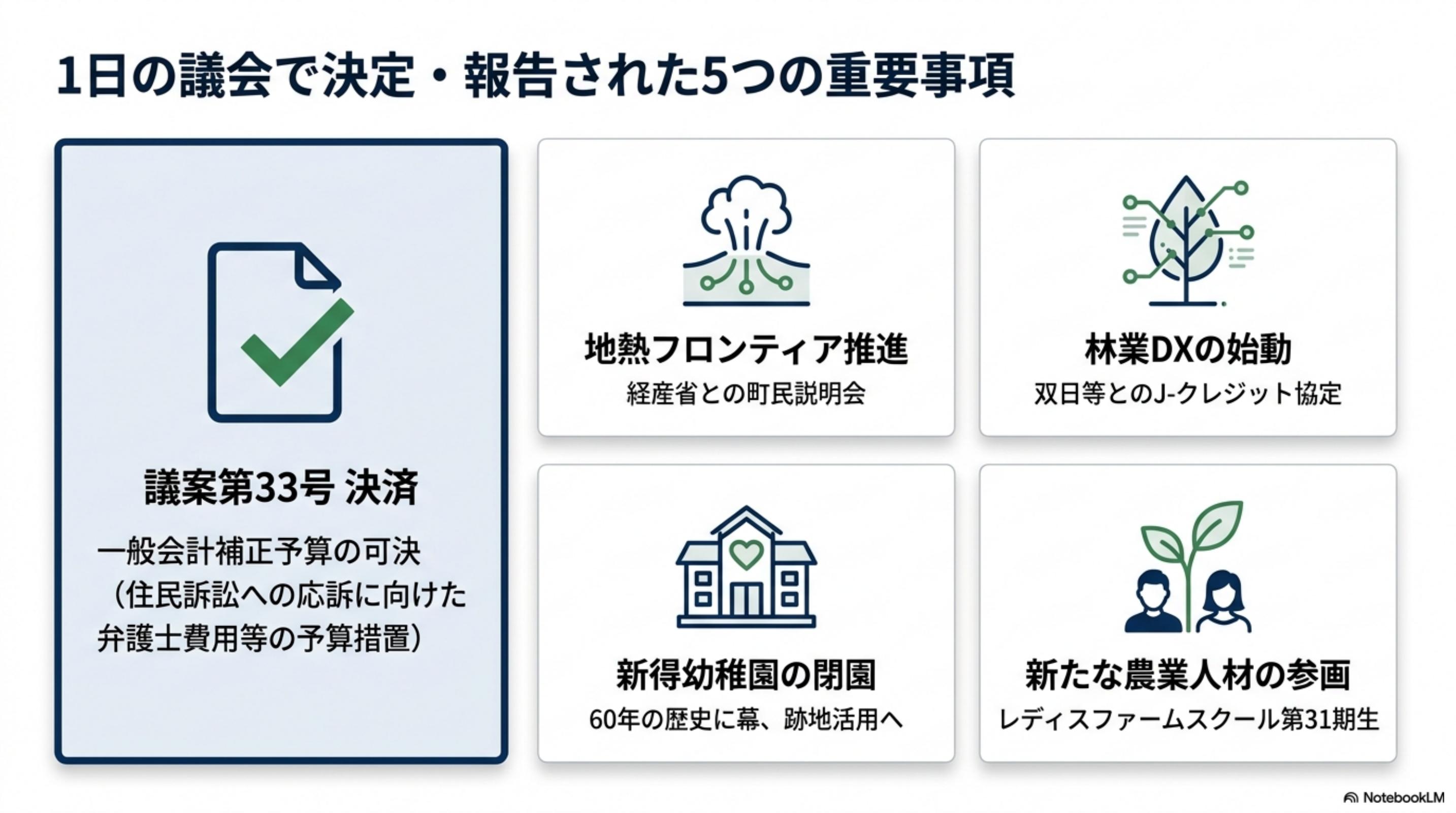 - 新得ミルクへの貸付金をめぐる住民訴訟(1億5千万円)への対応として、弁護士費用110万円の補正予算(議案第33号)を審議・可決。行政報告では地熱・林業DX・幼稚園閉園も報告。