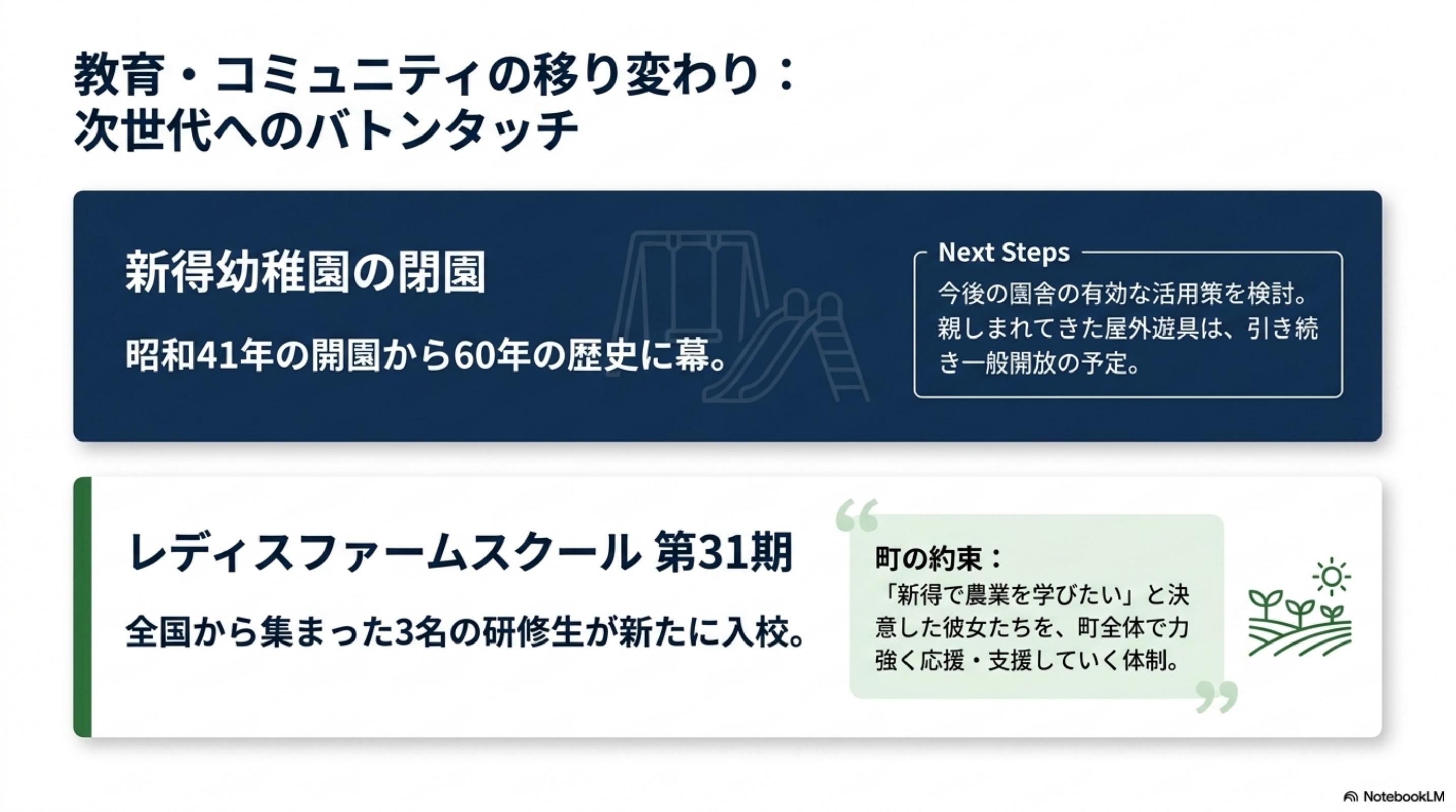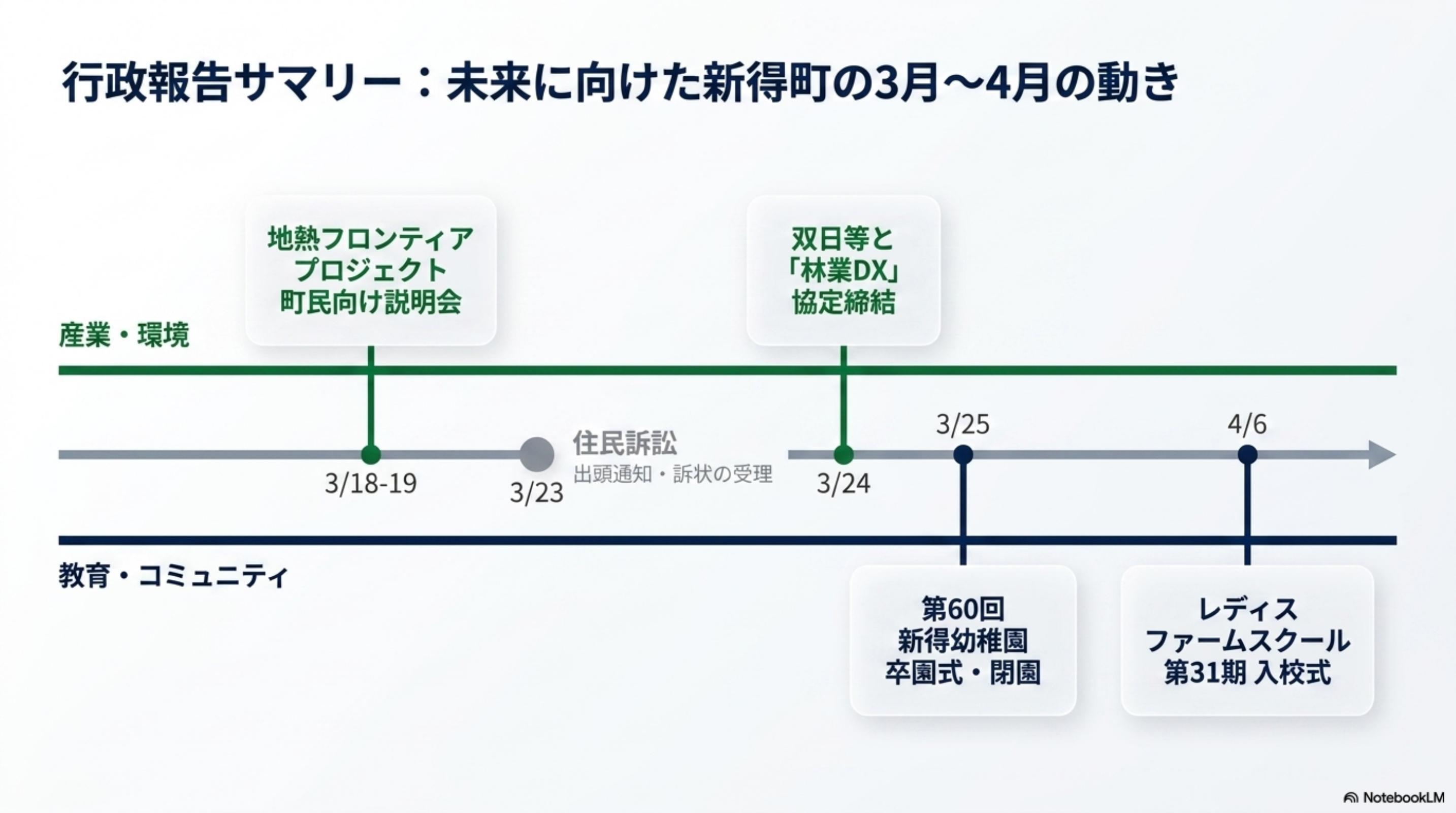 - 釧路地裁での応訴手続きの進捗、地熱フロンティアプロジェクトの町民説明会結果、新得幼稚園跡地活用策の検討状況を注視。